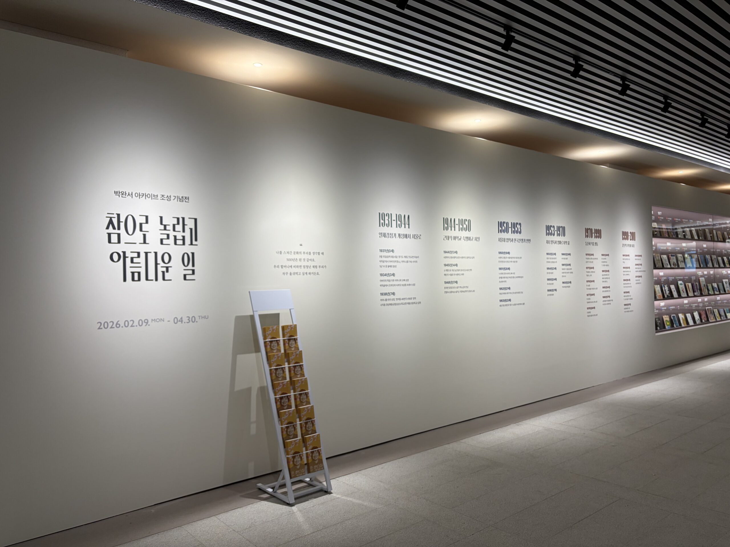 2023년 협약 체결 후 천일간의 노력 끝에 공개하는 박완서 아카이브에는 작가가 생전에 작품을 집필하던 자택 ‘아치울 노란집’의 서재와 마당의 정원을 재현한 공간을 중심으로, 재봉틀·사진기·해산사발·수제 옷 등 작가가 직접 사용하던 생활 유물과 친필 원고·일기·편지 등 귀중 육필 자료가 전시된다. 수증 자료 6,000여 점 중 470여 점을 엄선하여 처음으로 선보임으로써, 박완서 작가의 문학 세계뿐 아니라, 삶의 궤적과 사유의 흔적을 입체적으로 경험할 수 있도록 꾸몄다.